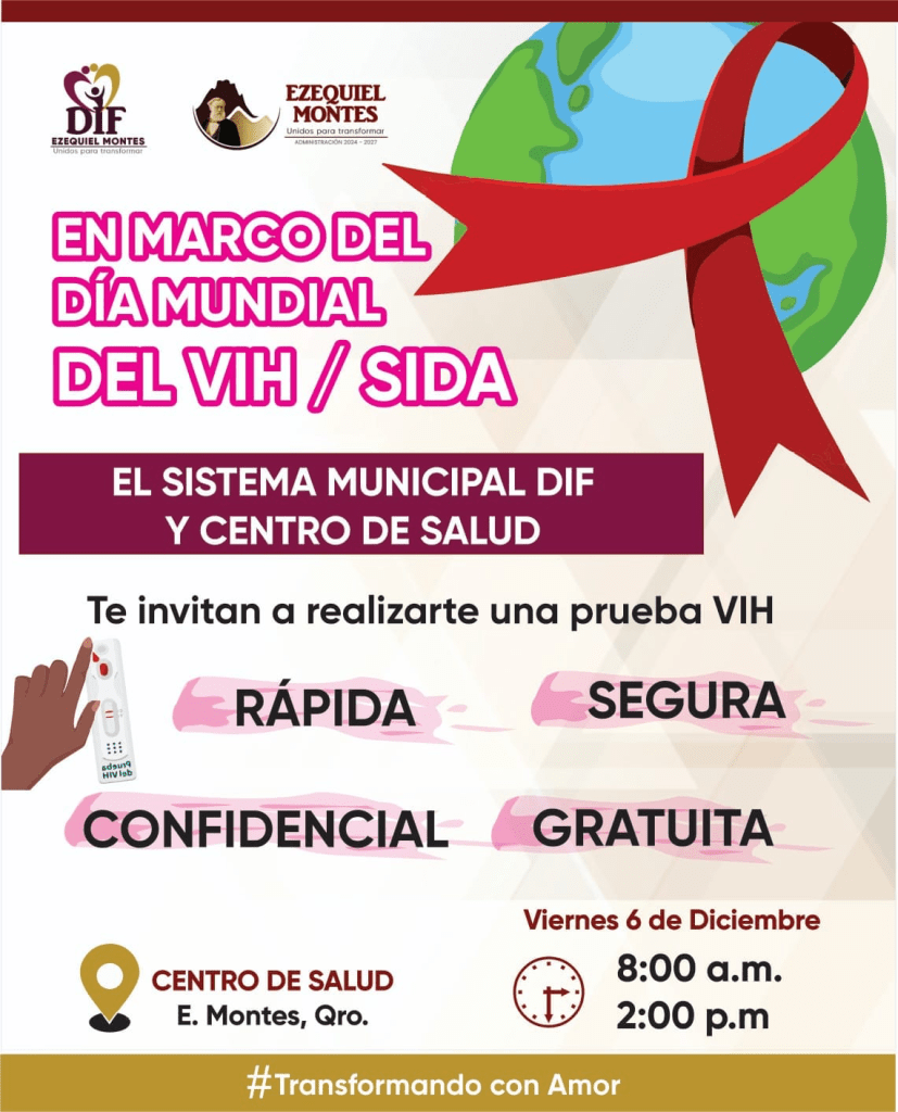 Con motivo del Día Mundial del VIH/SIDA, el DIF Municipal de Ezequiel Montes, en colaboración con el Centro de Salud, llevó a cabo una jornada de pruebas rápidas, seguras y gratuitas para la detección del virus. La actividad se realizó en el Centro de Salud local, con el fin de reforzar el compromiso del DIF con la salud pública y la promoción de una cultura de prevención. Estas acciones buscan sensibilizar a la comunidad sobre la importancia de la detección temprana y el cuidado adecuado para quienes pueden estar en riesgo. La jornada fue una oportunidad para ofrecer acceso a información y servicios esenciales, fomentando el bienestar y la salud en el municipio.