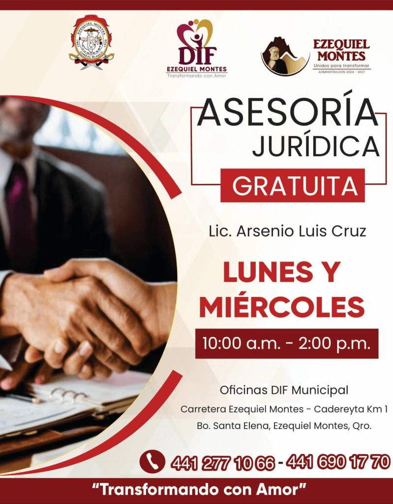 El DIF Municipal de Ezequiel Montes ha puesto a disposición de la población un servicio gratuito de asesoría jurídica, con el fin de apoyar a las personas que se enfrentan a situaciones legales complicadas. La asesoría se ofrece los lunes y miércoles de 10:00 AM a 2:00 PM en las instalaciones del DIF Municipal.